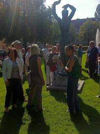 Zwischen dem "Morgen" und dem "Abend" haben die BesucherInnen des Stadtspaziergangs mit der Friedenauer Abgeordneten Dilek Kolat interessante Details aus der Geschichte und Architektur der Ceciliengärten erfahren. Gudrun Blankenburg, Berliner Stadtführerin, erzählte vom Fassadenschmuck der Häuser, die verschiedene Darstellungen zu den Themen Kinderspiel und Verkehr zeigen sowie von der Formensprache der unterschiedlichen Türgestaltungen aus dem Art Déco.